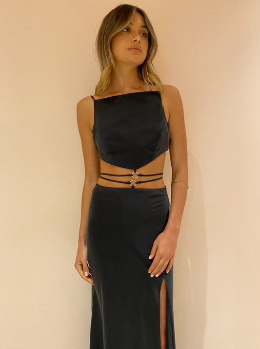 Elevating this maxi skirt with its strappy O-ring detail and thigh high leg split for Coco girls to glide through birthday celebrations, date night and cocktail hour in.
