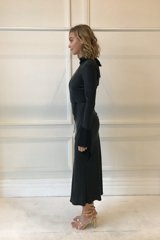 The Bec and Bridge Clara midi dress is a washed silk satin long sleeve bias cut midi dress. Crafted from 100% silk and features contrast silk georgette cuffs + neck tie, detachable thin rouleau tie at waist, cut on the bias for flattering fit and is bra friendly.