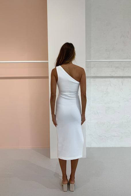 The Bec and Bridge Gemma midi is a bonded crepe, one shoulder dress with tuck detailng and subtle side split.