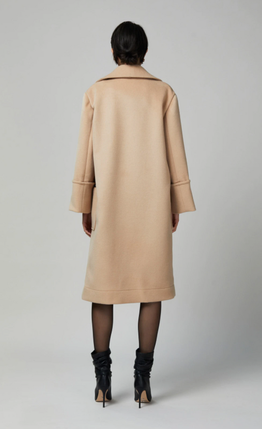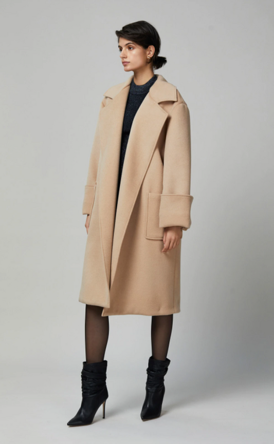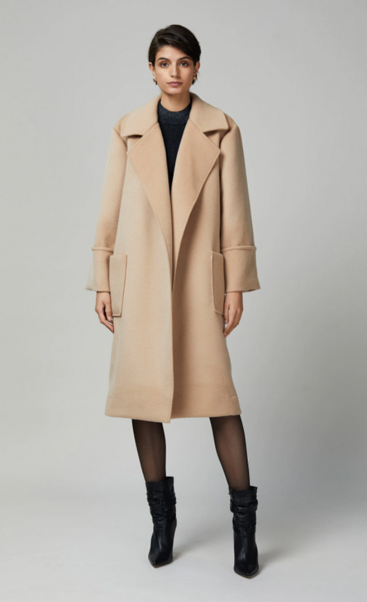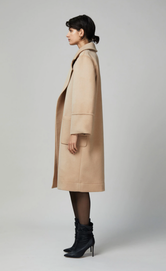The Genevieve is a longline wool coat with patch pockets, extended lapel, wide cuff and relaxed sleeve.