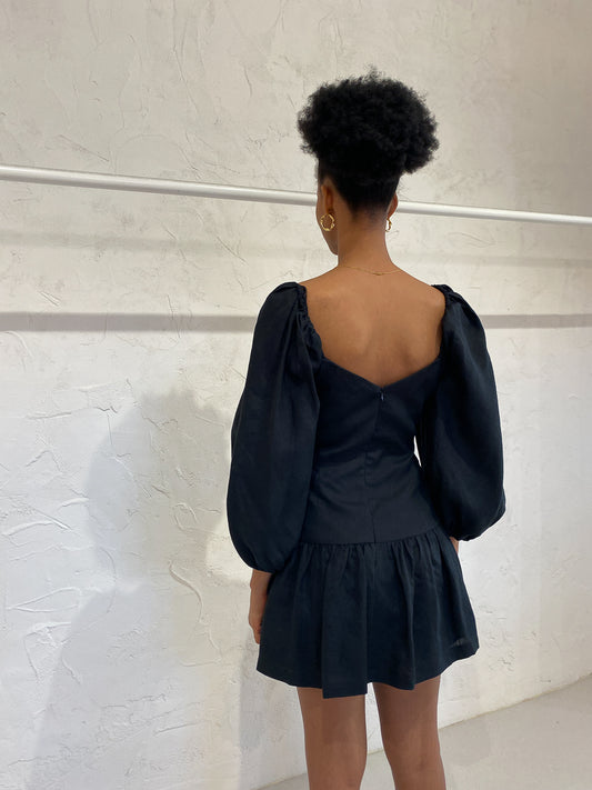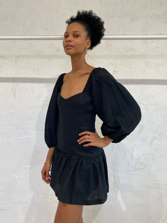 Crafted locally in Australia, this panelled linen mini dress features a soft flounced sleeve with an elasticated cuff, drop waist and a delicate sweetheart neckline.