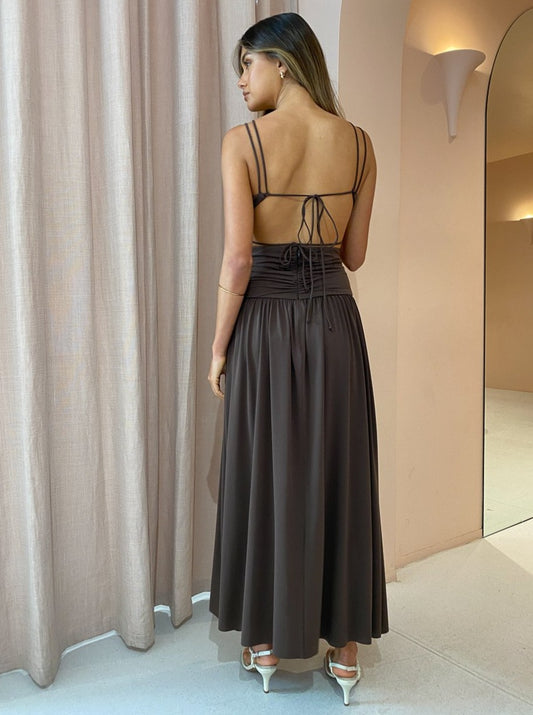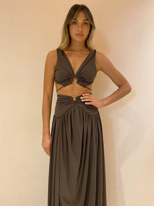 Falling into a floaty maxi length and finished with a U-ring detail and thigh high front leg split for birthday celebrations, cocktail hour and wedding festivities.
