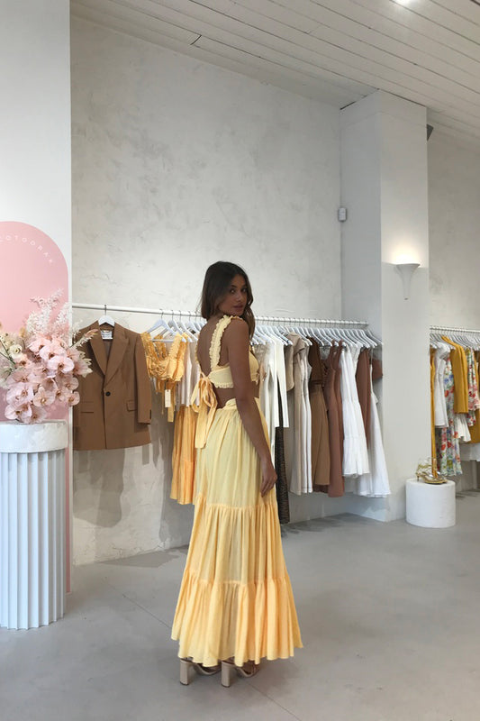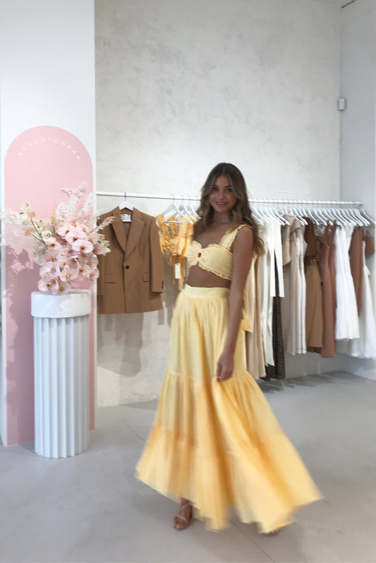 Styled here with the Bec and Bridge Koa maxi skirt. Style with a tan Summer sandal and faux glow.