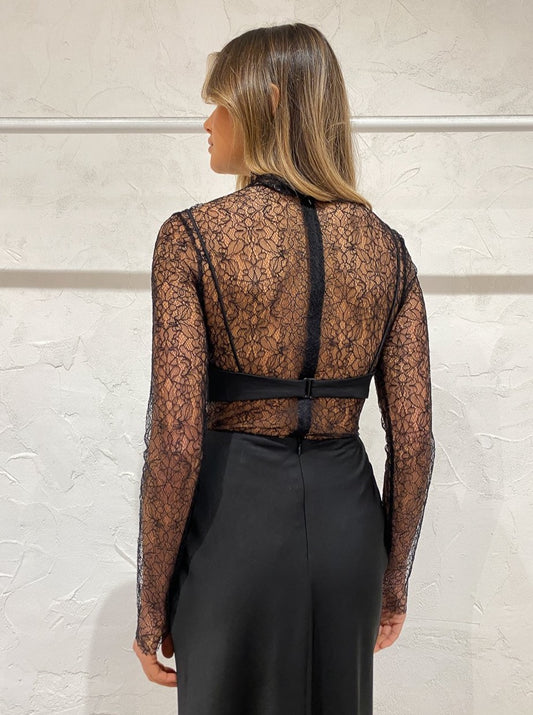 A delicate and sheer bodysuit, the Lace Racer is designed to elevate your Coco evening wardrobe featuring a roll neckline, long sleeves and an invisible zip closure at the back.