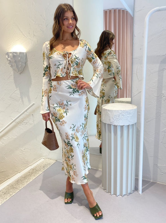 Designed in a feminine floral print and featuring an elastic waistband and bias cut fabric, this maxi skirt sits beautifully on the body.
