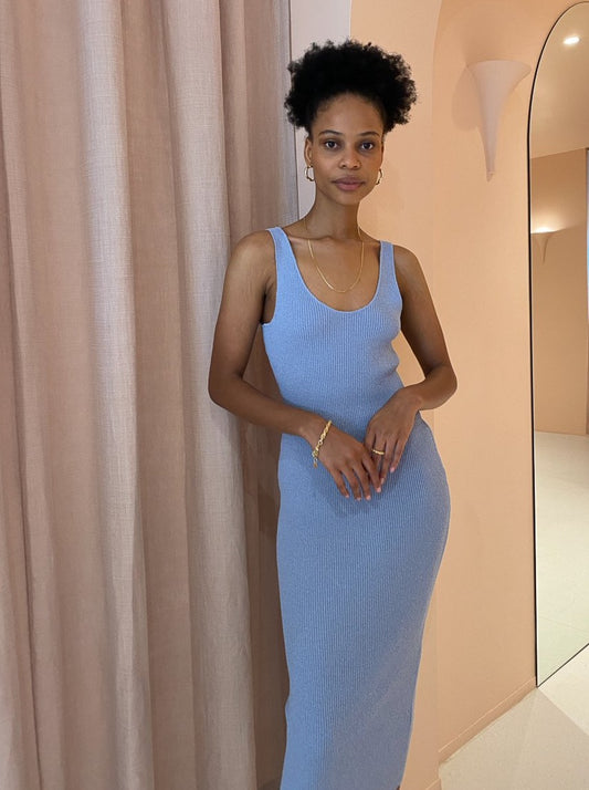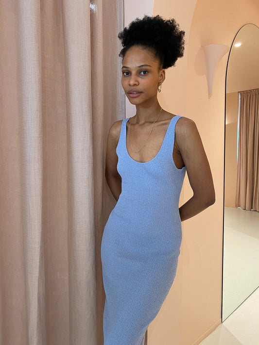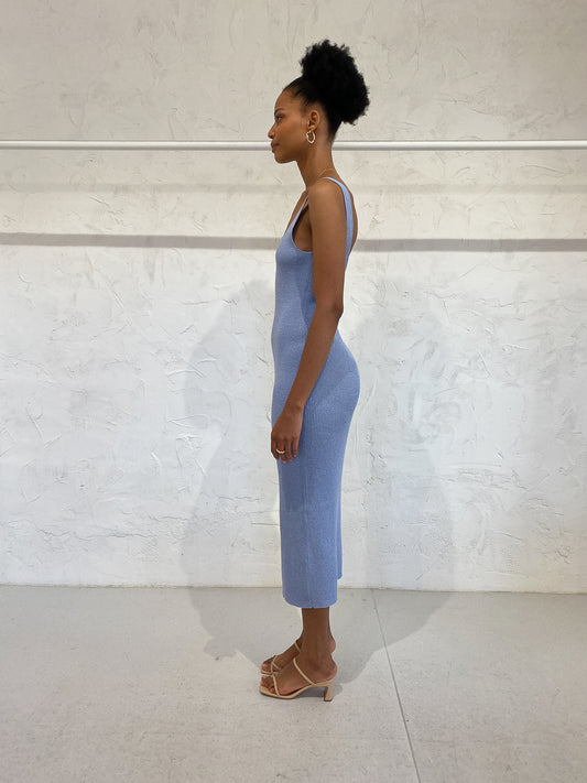 Designed in a dreamy shade of pale grey blue and a soft textured rib knit, this midi dress is bra friendly with a thick strap and scoop neck shape.