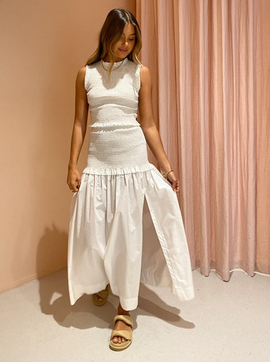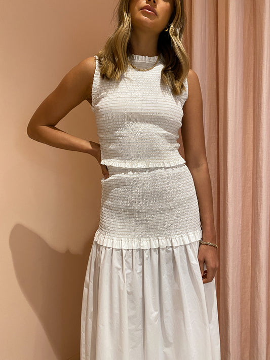Super versatile, this delicate elastic shirred top is designed to finish at the waist and to be paired back with high waisted skirt or pants.