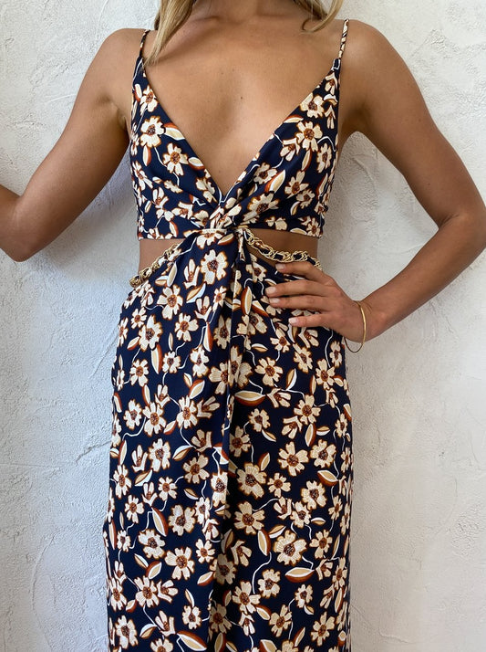 Crafted from a Rayon blend fabrication, this bias cut dress is designed to skim the femme form elegantly. Featuring a twist front V-neckline, waist cut outs and a maxi length skirt that is complimented with a front leg split.