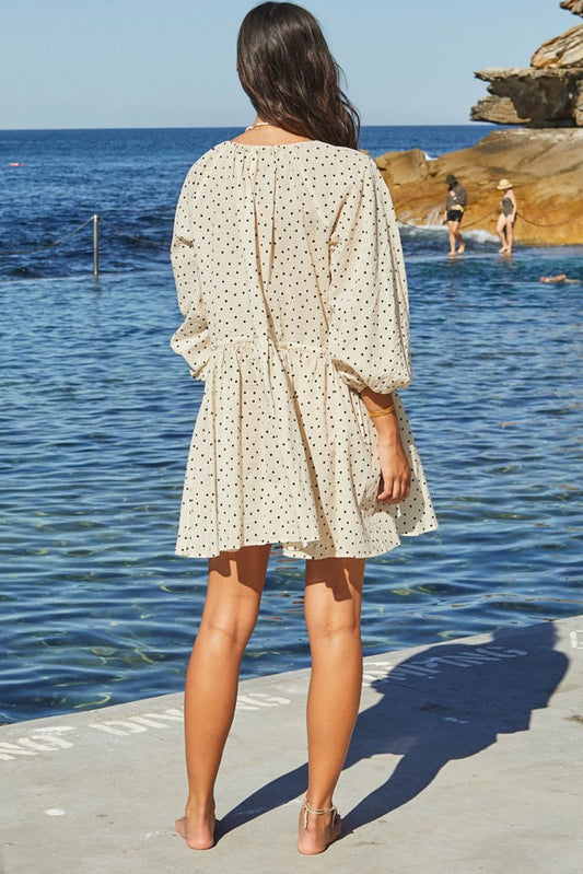 This cotton spot mini dress features blouseon sleeves, V neckline and functional rouleau ties at neck and a low waist.
