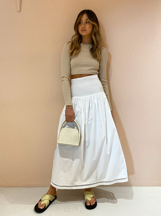 Coco Styling Tip: Complete the look with the Joslin Yoko Cotton Skirt/Dress in Optical White, the Alias Mae Soho Slides in Butter Leather, the Porter Baby Rolex Bracelet in Gold and finish with the Brie leon Evie Bag in Bone Croc
