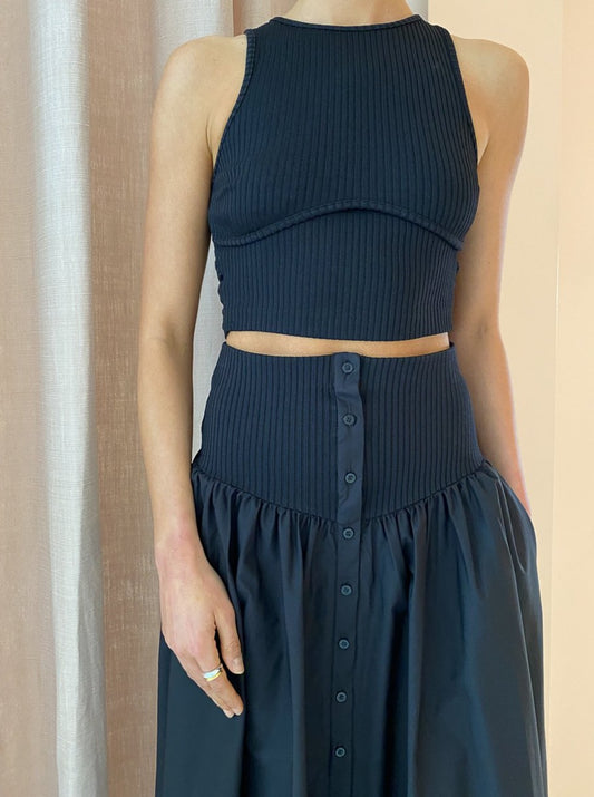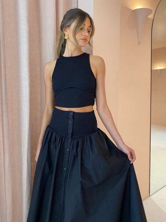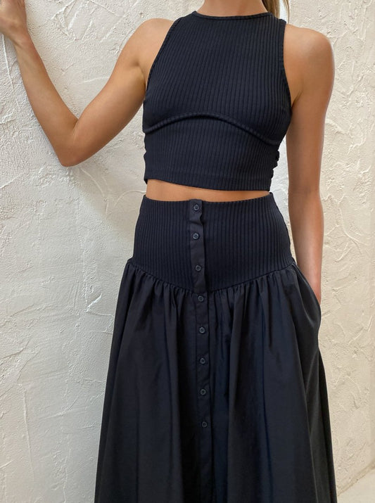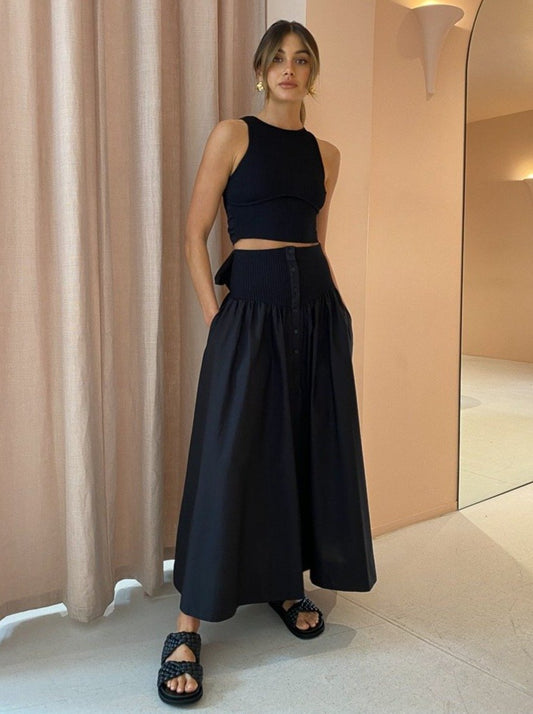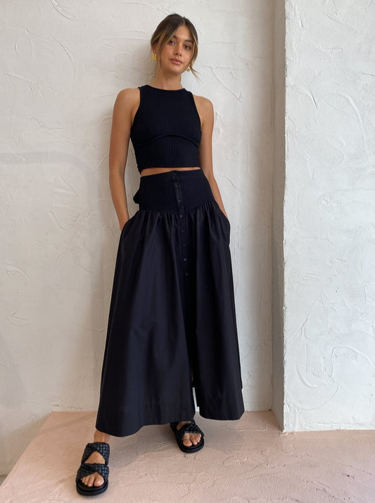 This midi length skirt sits high and firm on the contrast ribbed cotton waist and falls gracefully into a relaxed cotton poplin midi length skirt with side pockets.