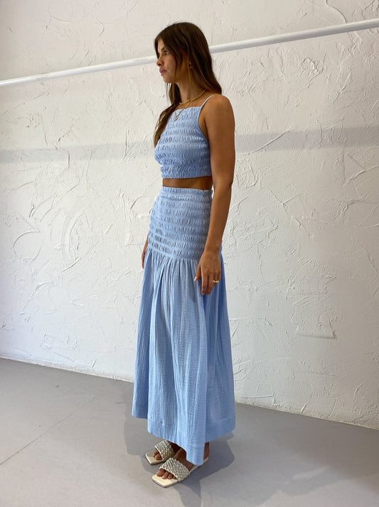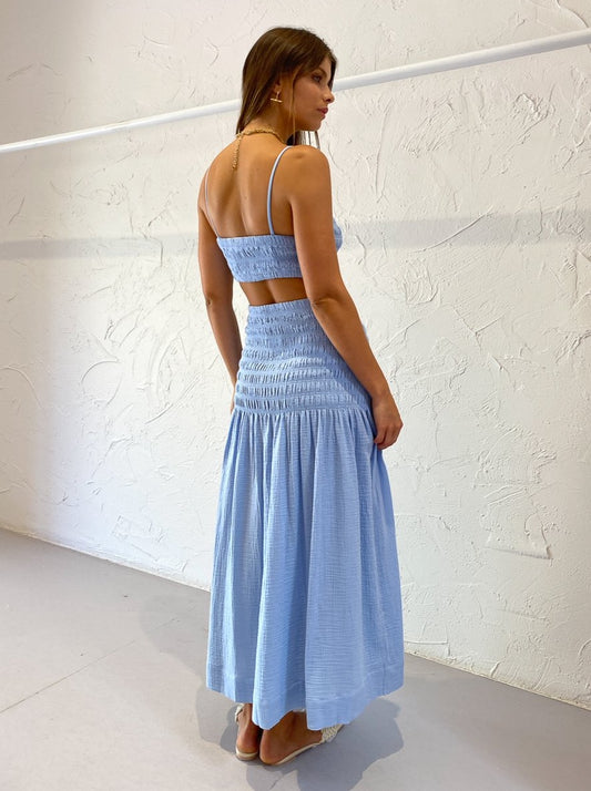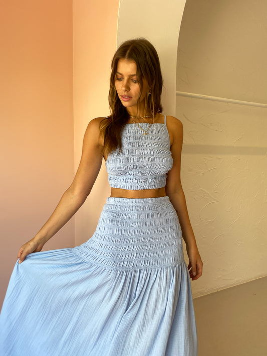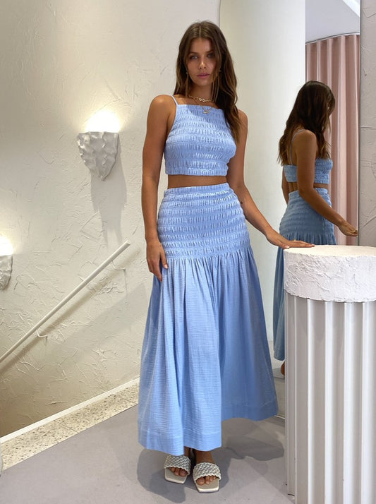 Sitting high on the waist and crafted in a cotton baby blue fabric and featuring a drop shirred waist, this piece will pair back effortlessly with your current staples.