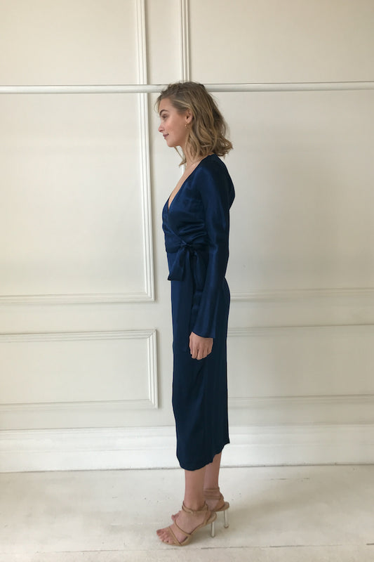 The Sylvie wrap midi dress is standard in size and we suggest taking your usual in this piece. Our model wears a size AU8/Small and is 179cm.