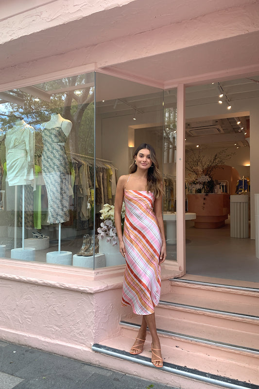 We love the exclusive Tommy print by Bec and Bridge. A bold and bright Mondrian inspired pattern in a combination of pink/red and orange.
