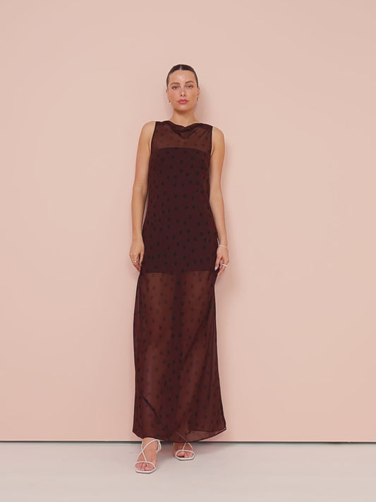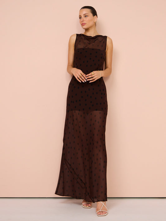 Step into luxury with the Bec + Bridge Turner Boatneck Maxi Dress in Chocolate/Black.