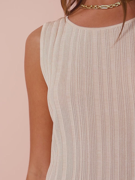 Constructed from a soft and comfortable ribbed knit, this dress features an effortlessly chic silhouette, tank style sleeves, fitted bodice and flared ankle.