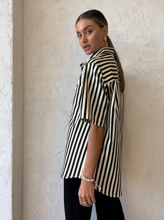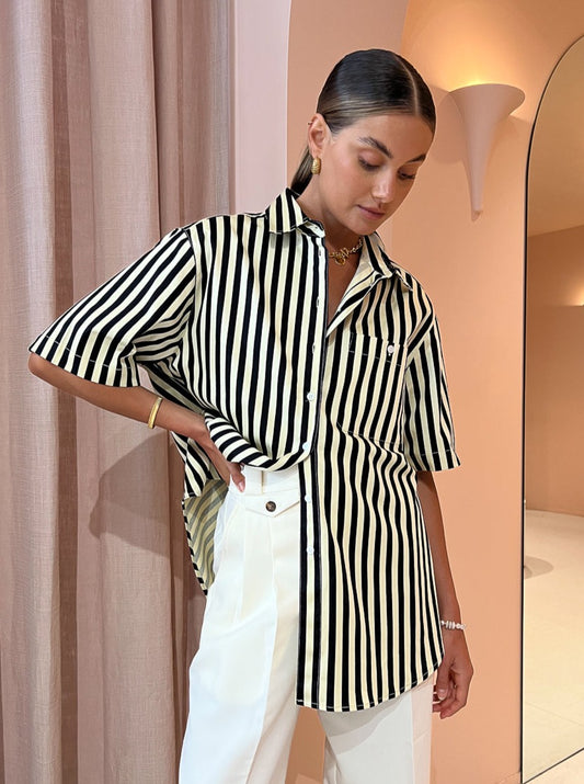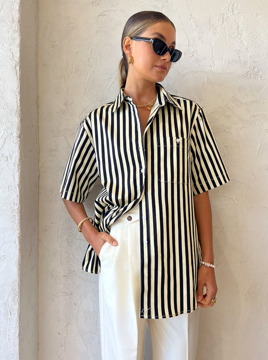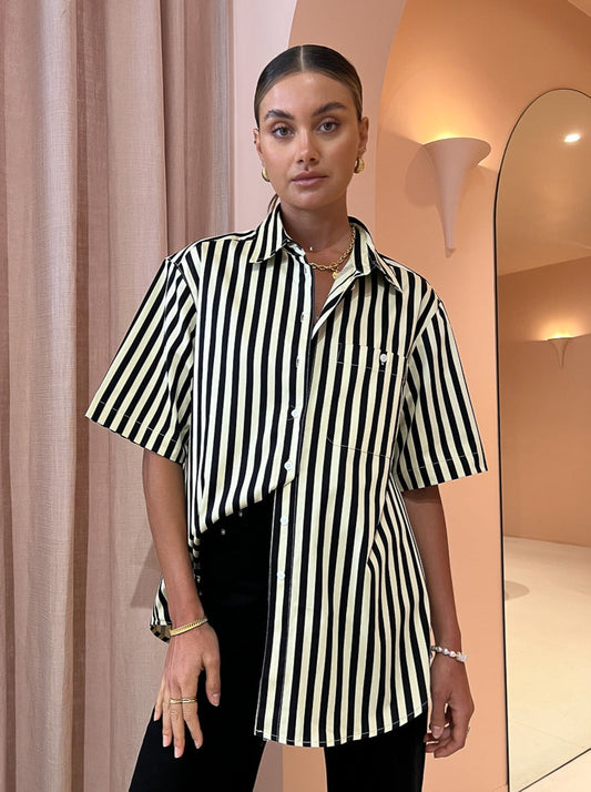 Crafted in 100% lightweight cotton fabrication and inspired by men's tailoring, this relaxed button up shirt features a striped pattern, short sleeves, button through front placket and a singular patch pocket.