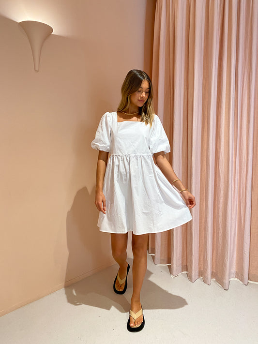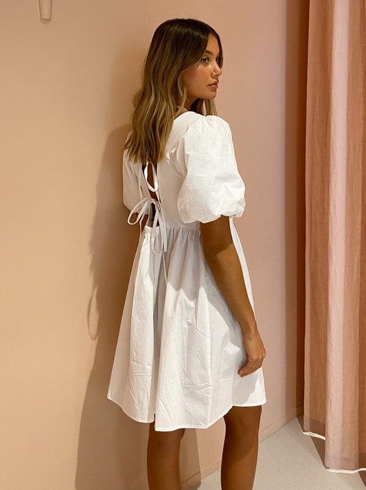 Crafted in 100% cotton, this super sweet dress features a capped puff sleeve and an open back with soft tie details to secure to add that feminine touch.