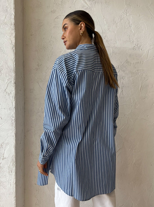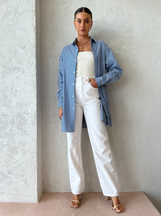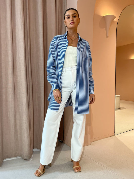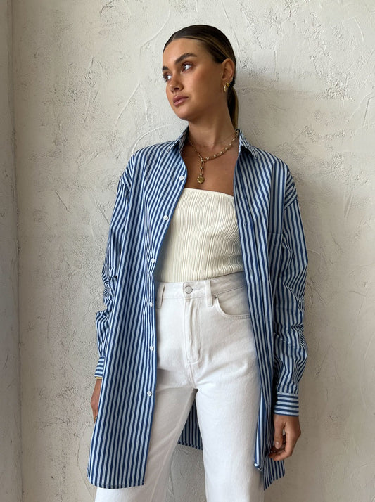 Finished in a thin blue/navy stripe is coveted by Coco girls for layering at the beach or pairing with heels for cocktail hour.