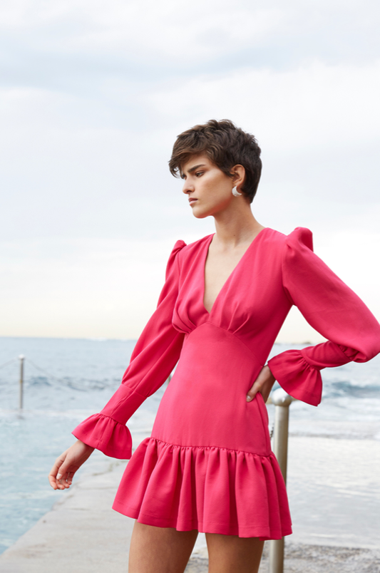 This modern, pop pink mini dress features a V neckline, long sleeves with fitted cuffs and feature frill on hem.