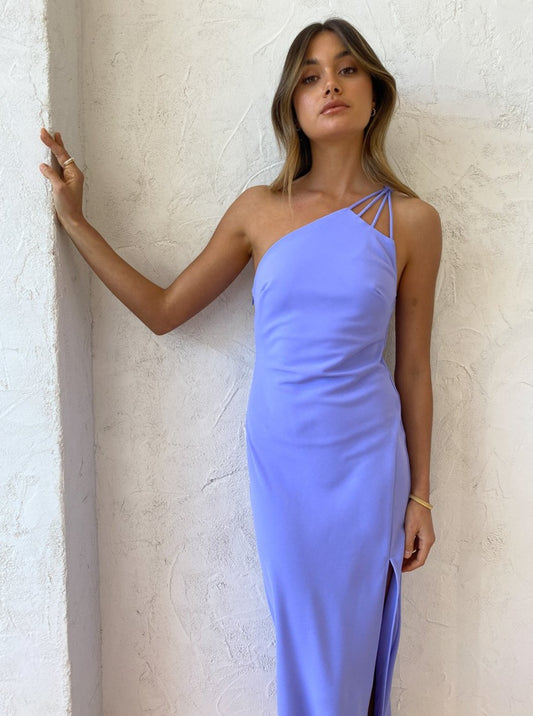 Inspired by contemporary design, the By Johnny Ariel Asymmetric Knot Dress in Violet will have Coco girls turning heads through their celebratory occasions.