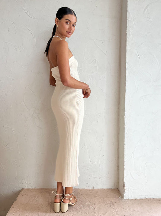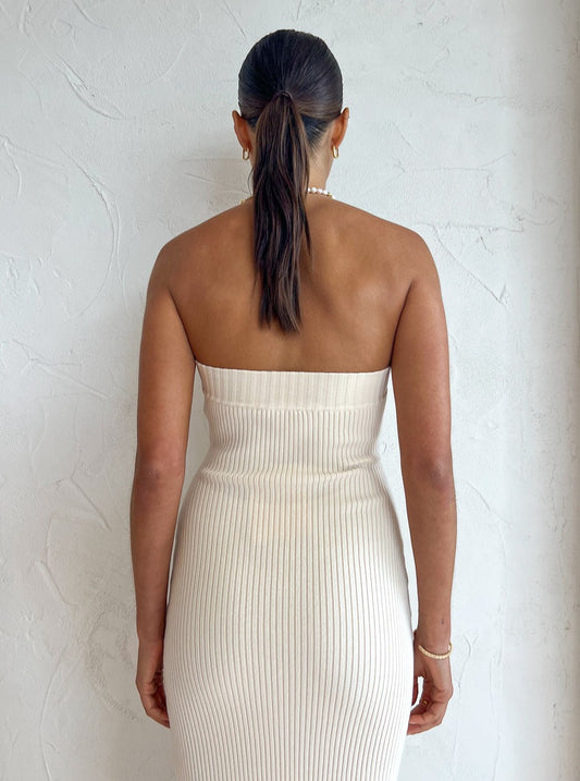 Enjoy luxurious staples with the Cashmere Cotton Strapless Midi Dress in Butter Cream from By Johnny.