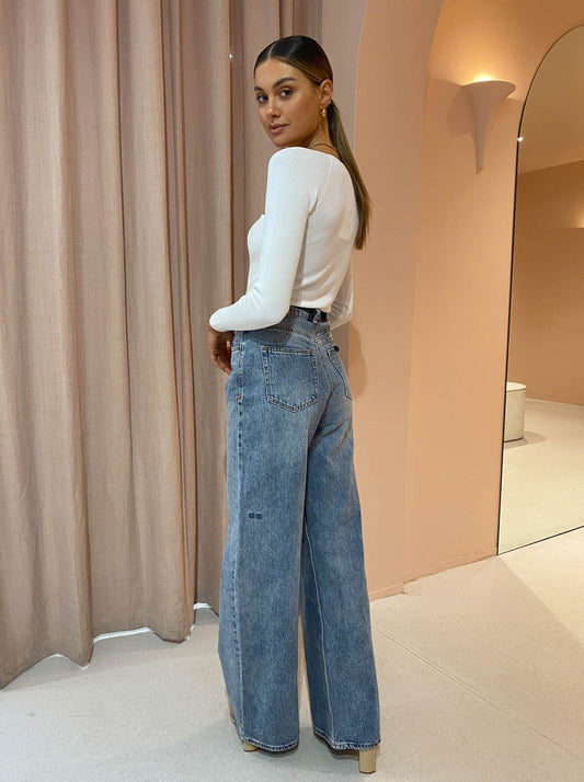 Complete with Ksubi Dettached Jean in Haven, Alias Mae Cassie Heel in Natural, Brie Leon Evie Bag in White Matte Croc, Porter Belcher Necklace in Gold, Porter Heritage Bracelet in Gold and Porter Tear Drop Huggies in Gold.