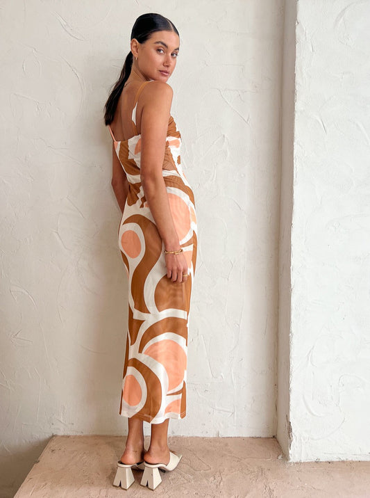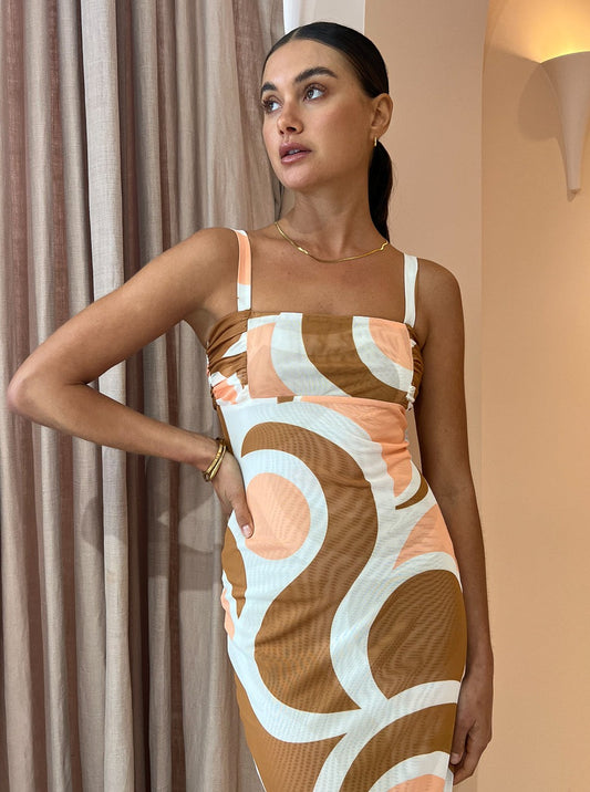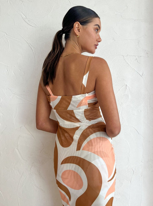 By Johnny Geo Maze Mesh Midi Dress in Brown Ivory Orange