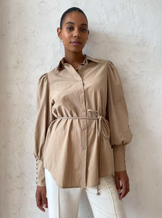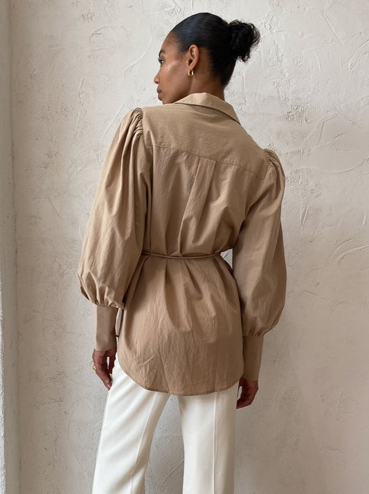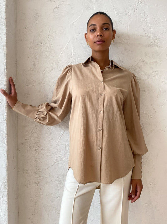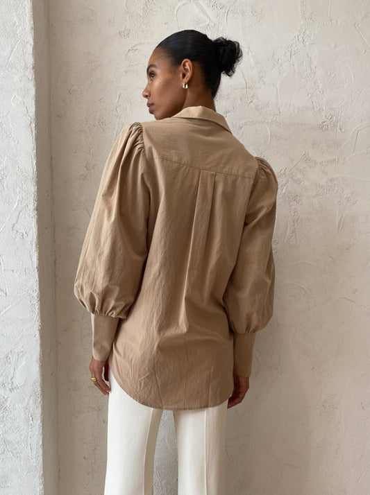 Crafted from a crisp cotton poplin, this relaxed shirt features large blouson sleeves, a gentle high low hemline and long cuffs finished with intricate button detailing.