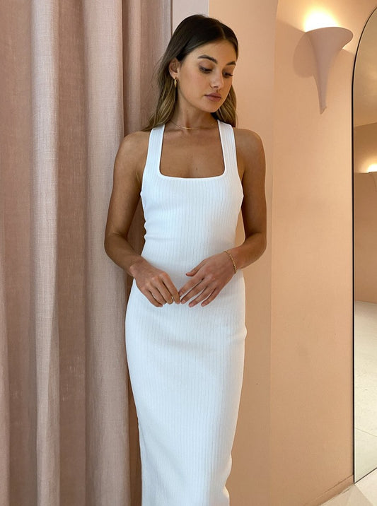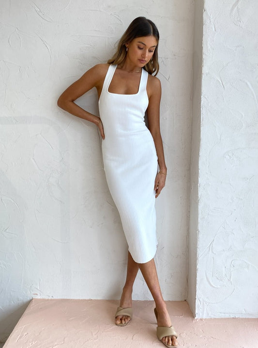 Designed to flatter and form, the Rey Racer is crafted from a heavy weight ribbed viscose blend. In a sophisticated and contemporary shape this Ivory midi is cut with a flattering square neckline and low racer back.