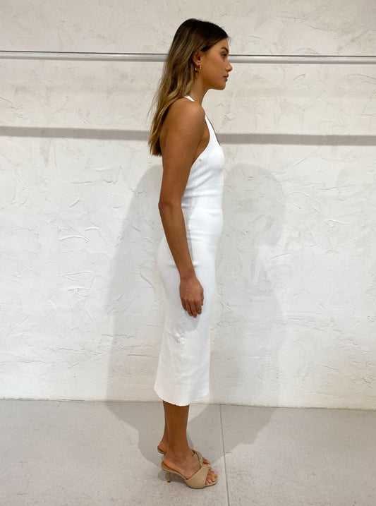The By Johnny Rey Racer Rib Midi Dress in Ivory is a classic silhouette to add to your on repeat rib knit repertoire.