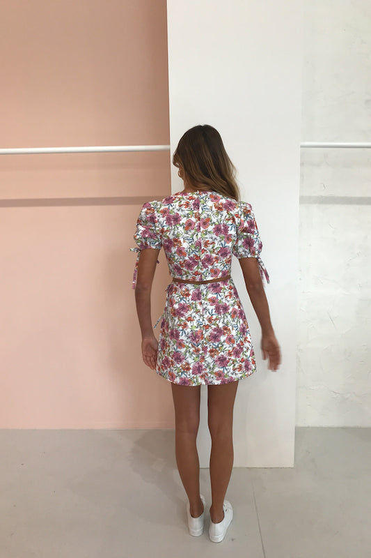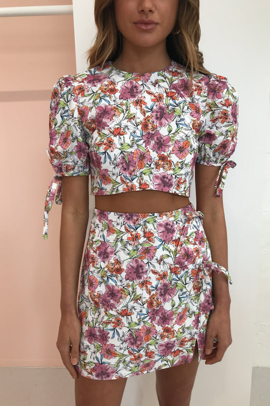 Crafted from a cotton/linen blend, this floral printed crop features a high crew neck, sightly puffed sleeve with adjustable ties.