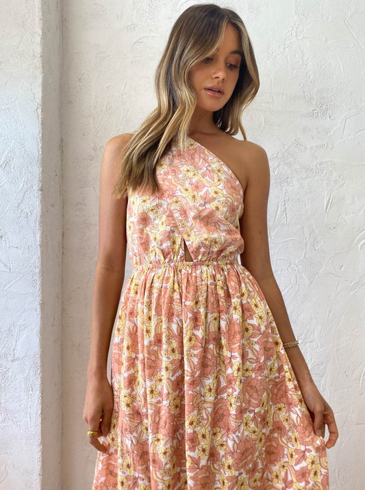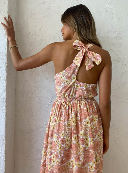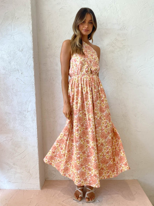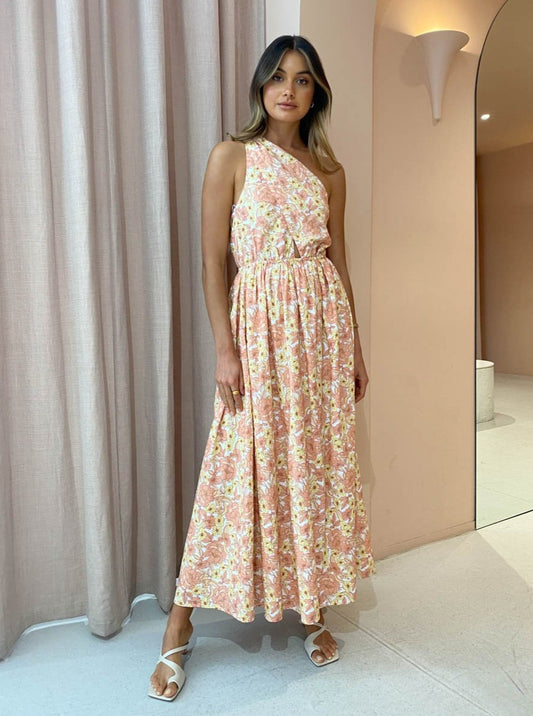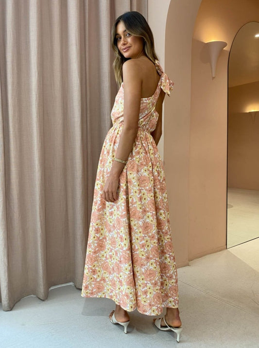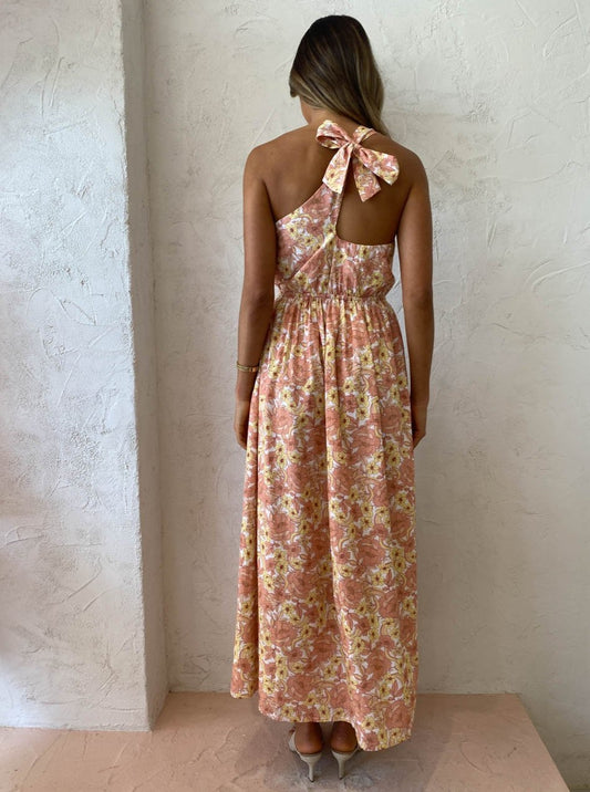 The EXCLUSIVE By Nicola Calypso Tie One Shoulder Maxi Dress in Light Sunrise Blooms will bring eternal romance to your Coco collection.