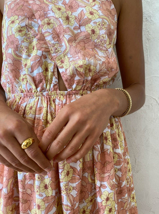 Feminine details are balanced by the playful centre front waist cut out making this maxi dress a go-to piece for wedding festivities, engagement parties and birthday celebrations.