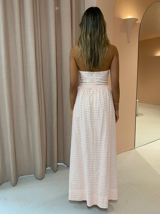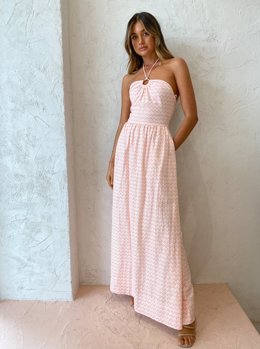 Made for sunshine days, this maxi dress is crafted from a Linen Cotton blend in a subtle zig zag print. Fitted through the bodice with boning before falling into an A line skirt, it features side seam pockets and versatile halter neckline that can also be styled strapless.