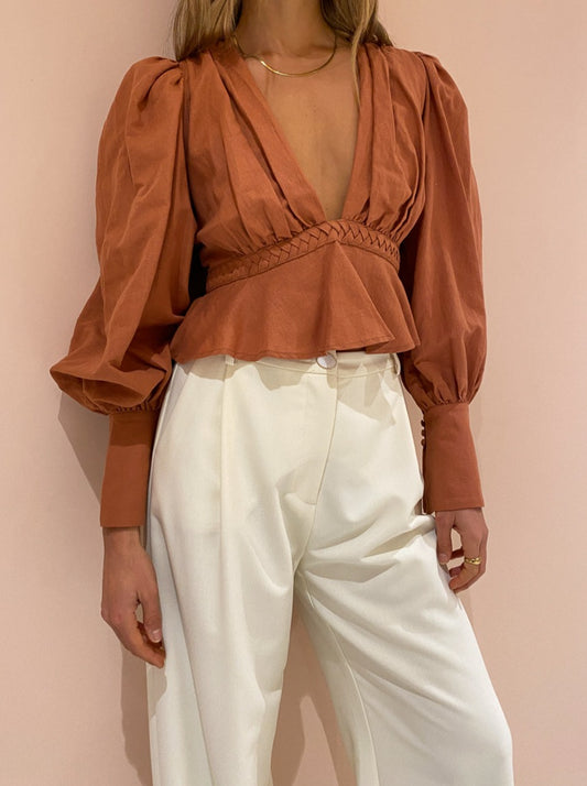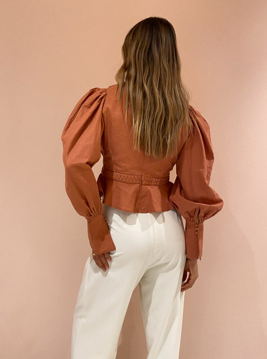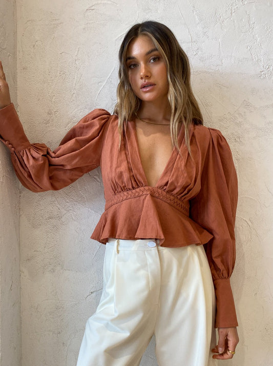 Thoughtfully crafted from a luxurious blend of Linen and Cotton, this top features billow sleeves detailed with a wide sleeve cuff and adjustable button tab. It's plunging neckline is complimented with gathers before falling into a fitted under-bust with a plait detail.