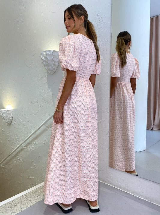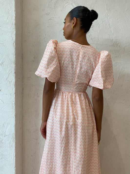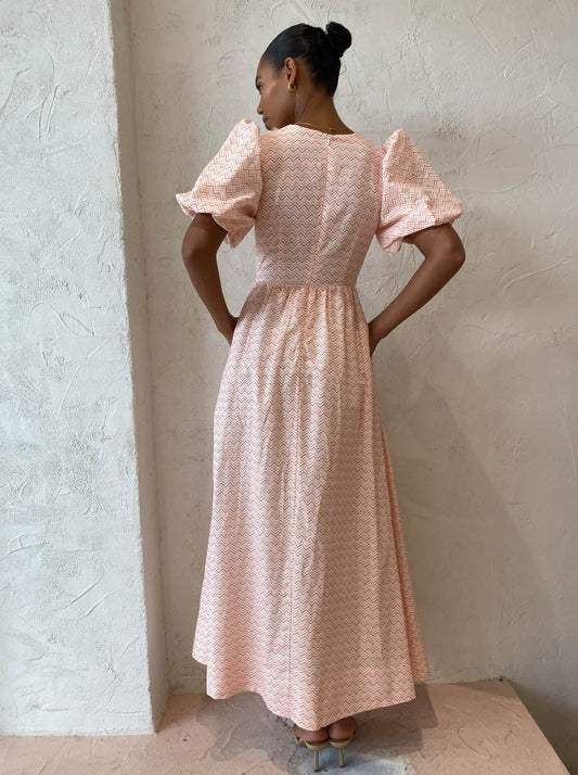 Crafted from a Linen Cotton blend fabrication in a zig zag print, this maxi dress features a high neckline, billow bubble sleeves and a floaty maxi hemline for a sophisticated and flattering silhouette.