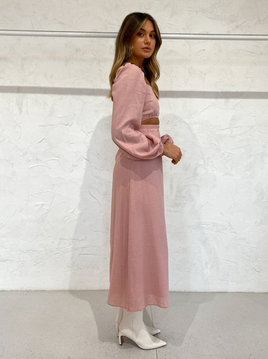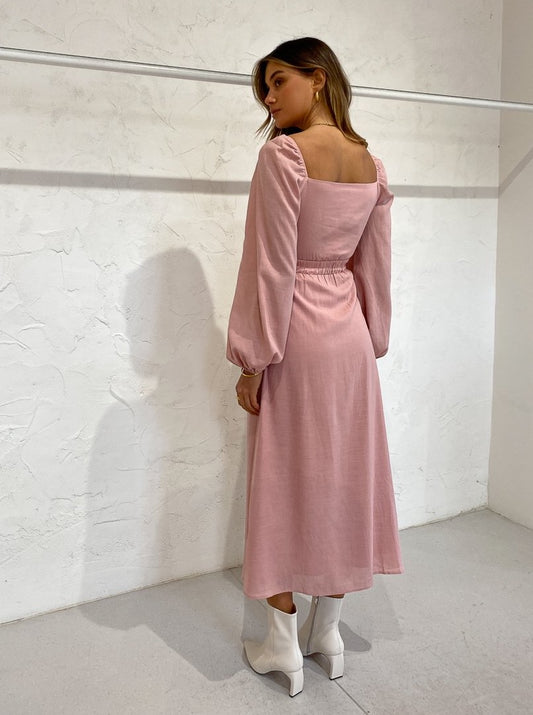Cut from a gorgeous Silk Linen blend, this effortlessly elegant midi dress in a Coco pink hue with square neckline and a gathered encased elastic waistband will be the perfect pairing for any special occasion in your diary.