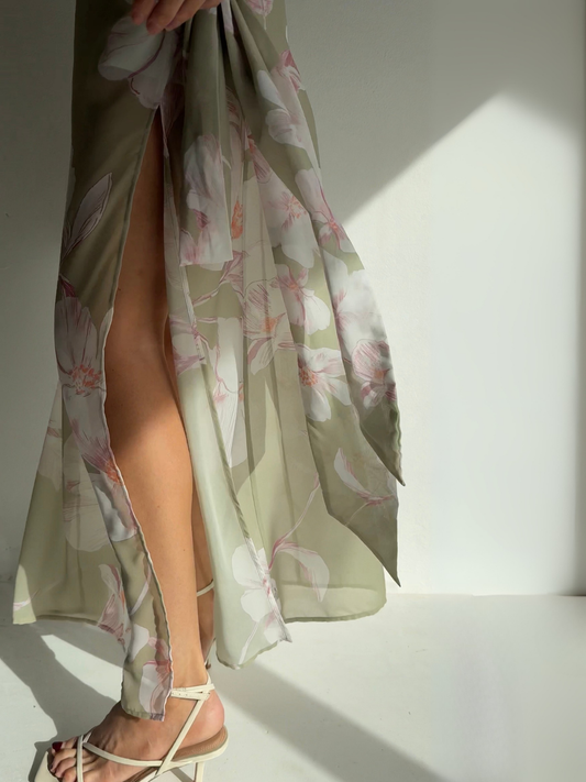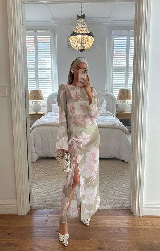 The Elodie Maxi Dress in Peppermint Floral features a left side twist detail for shape through the waist to the hip.