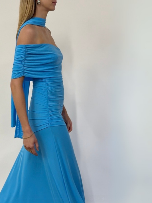 The elegant By Nicola Fiesta Off Shoulder Maxi Dress has come back in Bleu. Combining style and comfort for any special occasion. With its off-shoulder neckline and adjustable features, this dress offers a flattering fit and effortless elegance.