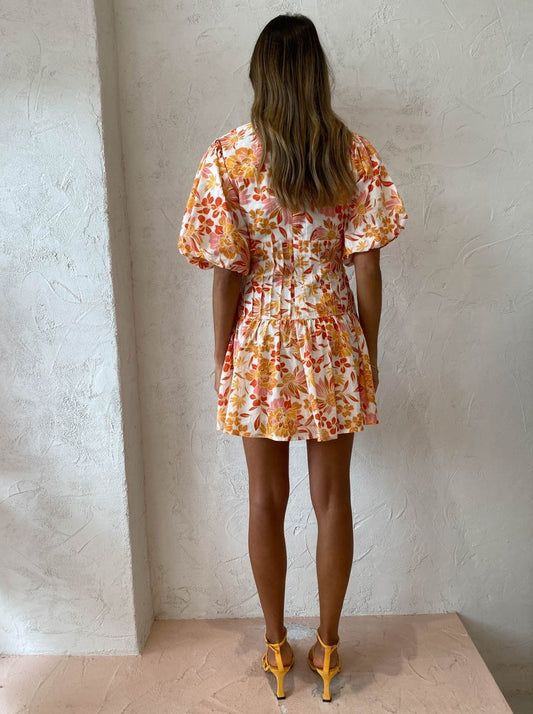 Designed with the Coco girl in mind, this charming mini dress is crafted from a non-stretchy breathable Textured Cotton Fabrication in an exclusive Red and Orange Tropical floral print. Fitted across the bust and vertical fold stitch detailed waist, it features a deep v plunging neckline and billow bubble sleeves with elasticated sleeve openings.