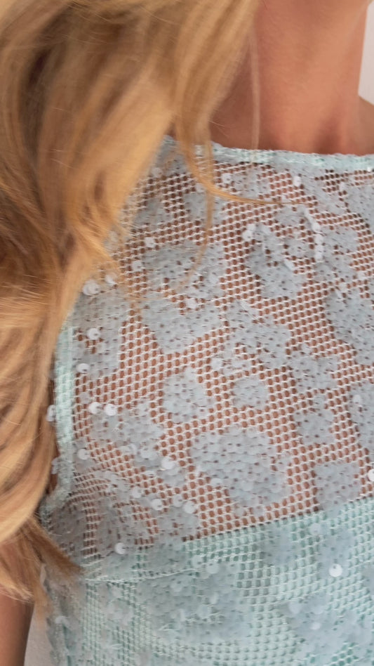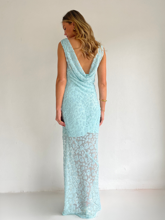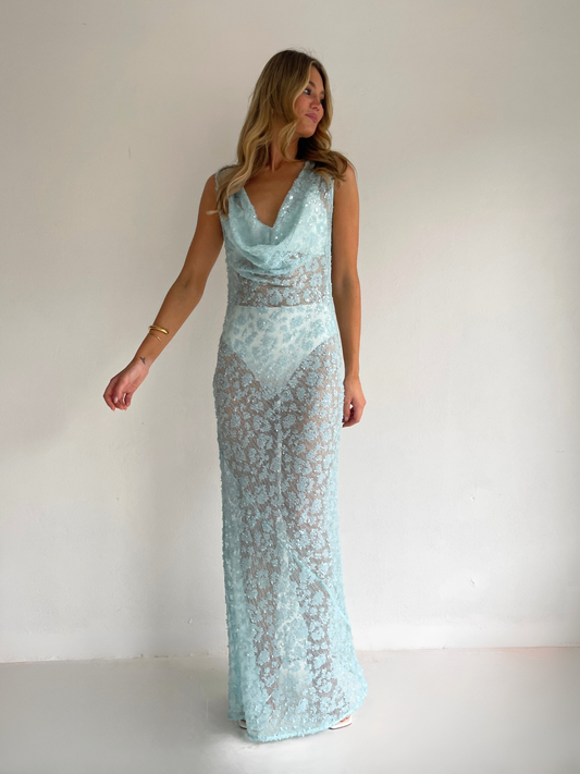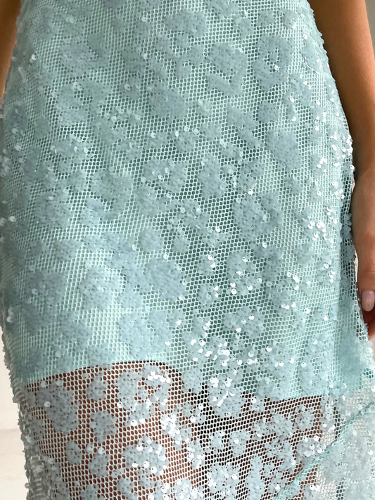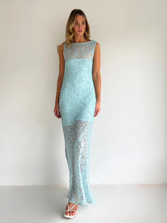 The Juno Maxi Dress in Powder Blue is made from a delicate sequin mesh.