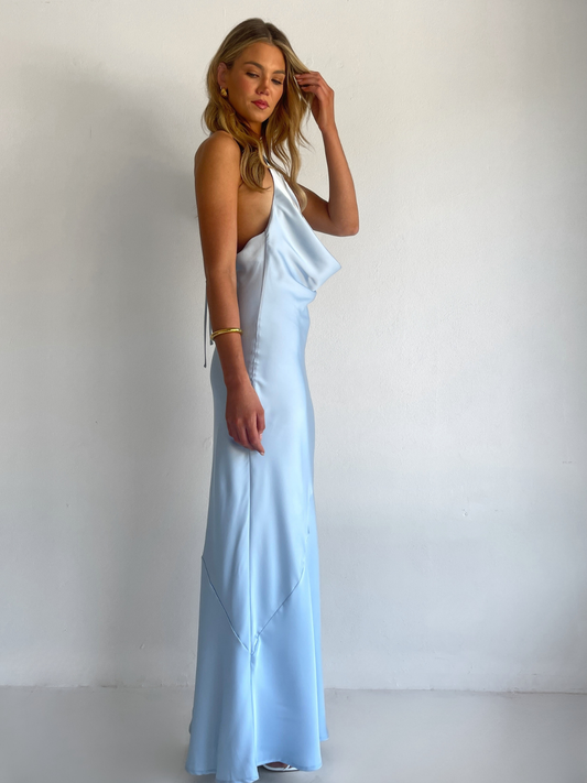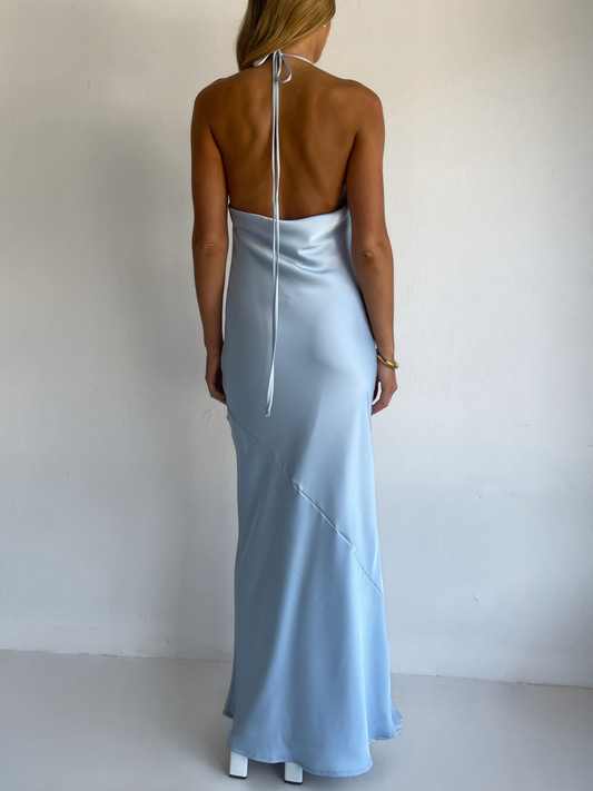 The Lucia Maxi Dress in Powder Blue features a bias-cut silhouette with a soft cowl neckline that can be styled multiple ways.