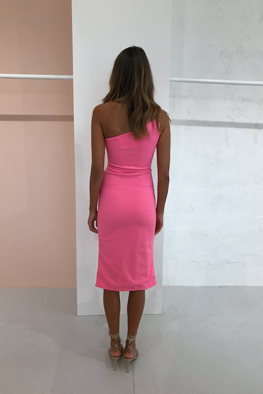 Crafted from stretch elastane, this LBD features an asymmetrical neckline, fine rouleau cord straps and subtle side split.