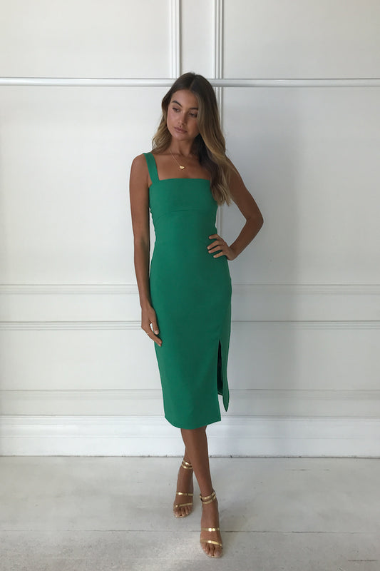 Featuring a one shoulder neckline with detailing to the bodice and side split, this midi is sure to turn heads thanks to the incredible Palm Green colourway.