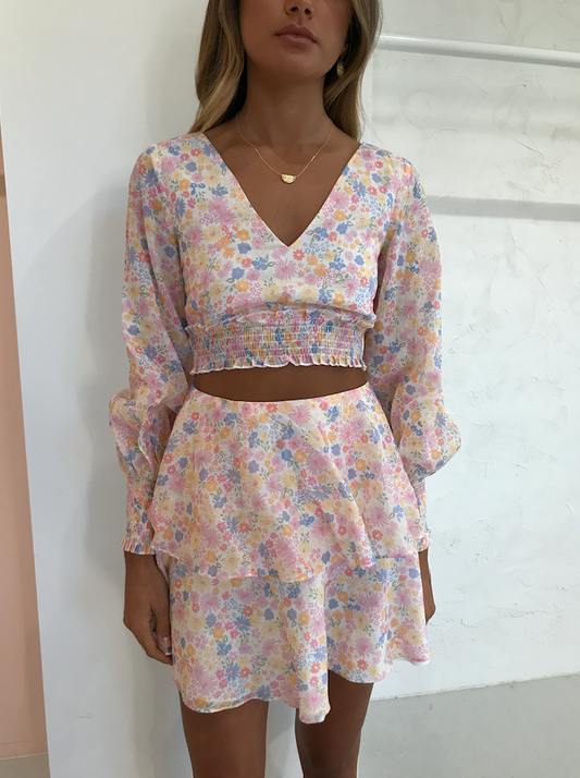 Make a statement this weekend in the Rosa top in Pastel Blooms. Style with Coco x Superga sneakers or Alias Mae heels and Amber Sceats jewels for a fun and modern look.