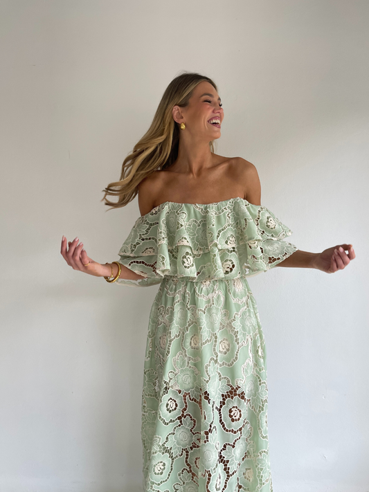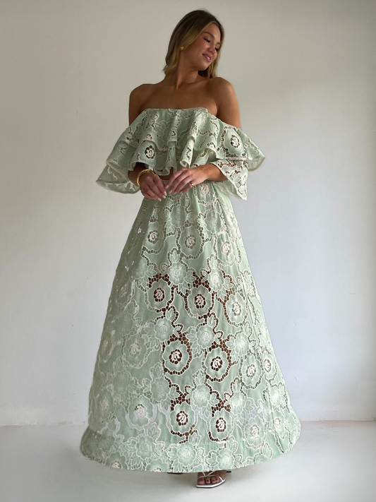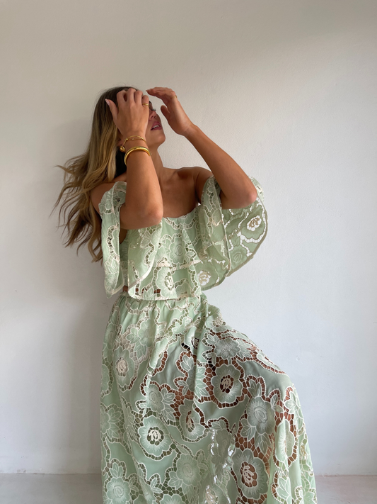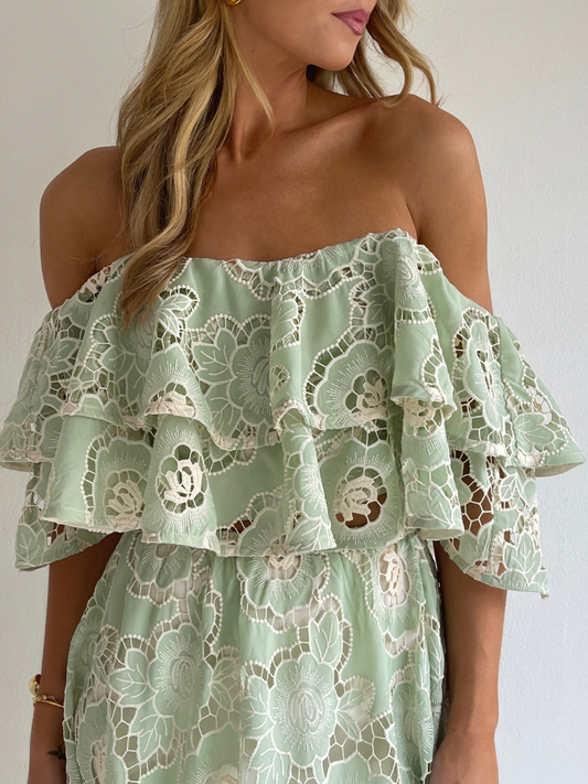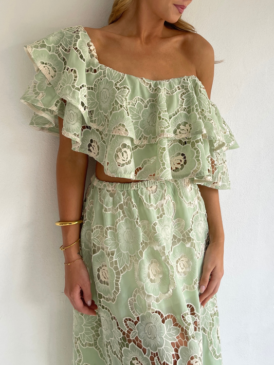 The Sibella Top in Mint Lace from By Nicola is made from a soft embroidered lace. Designed to sit both on and off the shoulder for styling versatility.