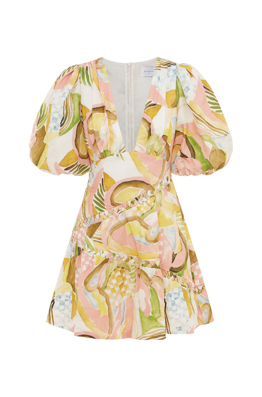 Crafted from a Linen Cotton blend, this mini dress flatters with a plunging V neckline, a tapered bodice before falling into an A line skirt with subtle gathers and features sweet puff sleeves and an asymmetric self fabric plaited detail throughout the waist and skirt.