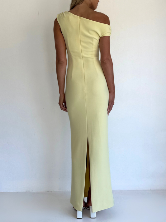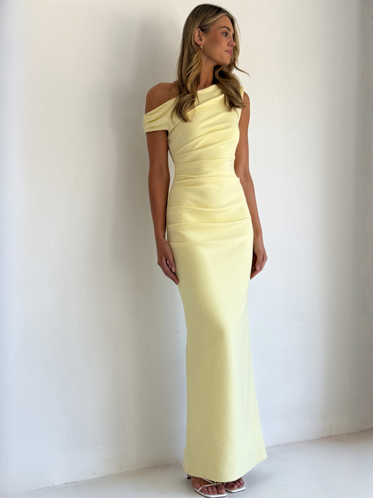 The Sophia Maxi Dress in Pastel Lemon is made from a heavy weight textured crepe with stretch.
