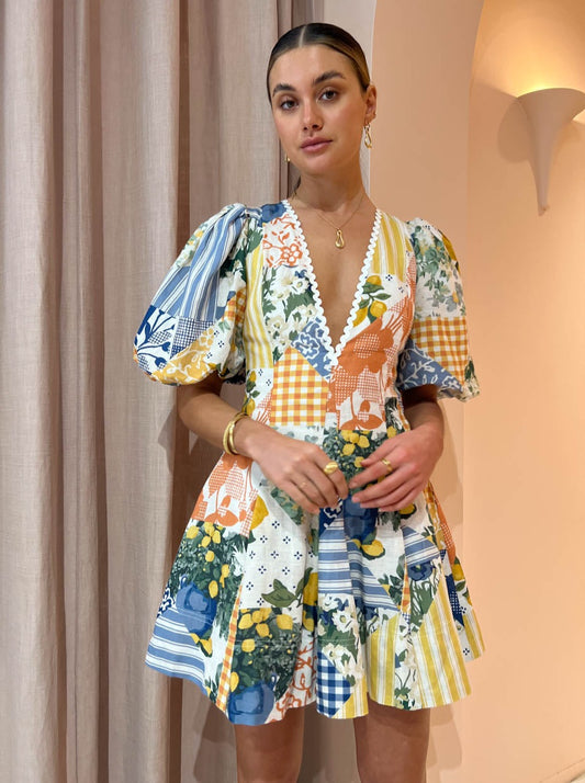 By Nicola Wavy Mini Dress in Lemon Patchwork